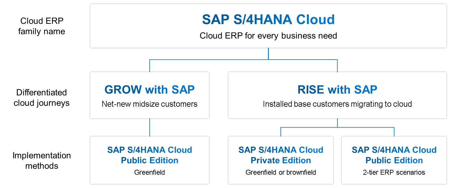 Rise with SAP的核心云ERP是SAP S/4HANA Cloud Private Edition,即SAP ERP私有云版本,可以更好地支持客戶遷移到云端。用量身定制的方式來適應云ERP的獨特轉型。它為客戶的數(shù)字化轉型之旅提供端到端支持。 GROW with SAP的核心云ERP是SAP S/4HANA Cloud Publice Edition,即SAP ERP公有云版本,旨在支持那些希望以速度、可預測性和持續(xù)創(chuàng)新的方式采用云ERP的客戶的優(yōu)先級。它強調采用SAP的智能應用程序套件和以云為中心的方法來推動創(chuàng)新和業(yè)務增長。 二、包裝和靈活性