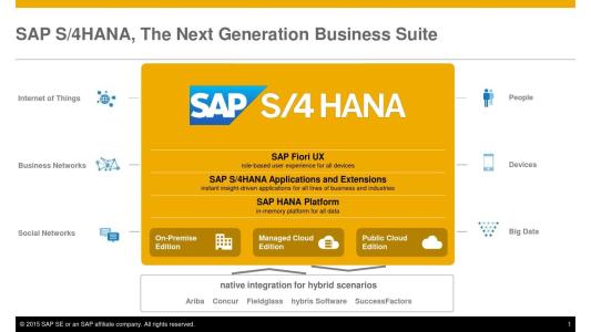S/4 HANA它應(yīng)該也是SAP邁出的第一步,所謂的第一步就是我將核心的功能放到云上,既可以是管理的云,也可以是公有云,因此S/4 HANA是完全支持包括完全的云戰(zhàn)略,混合云戰(zhàn)略和本地的云戰(zhàn)略,應(yīng)該說(shuō)它是和SAP整個(gè)云的戰(zhàn)略是密切新契合的。